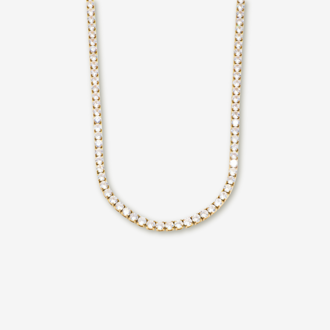 Add instant sophistication to your style with our Classic Tennis Diamond Necklace. Designed to deliver brilliant shine day after day, this piece features a sleek line of dazzling stones set in polished, gold-plated stainless steel—creating a look that’s both timeless and on-trend.