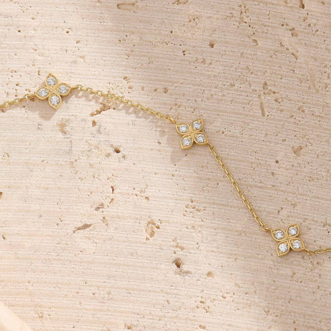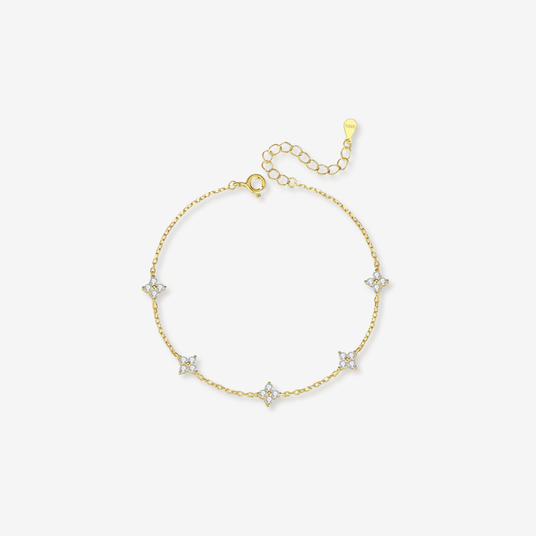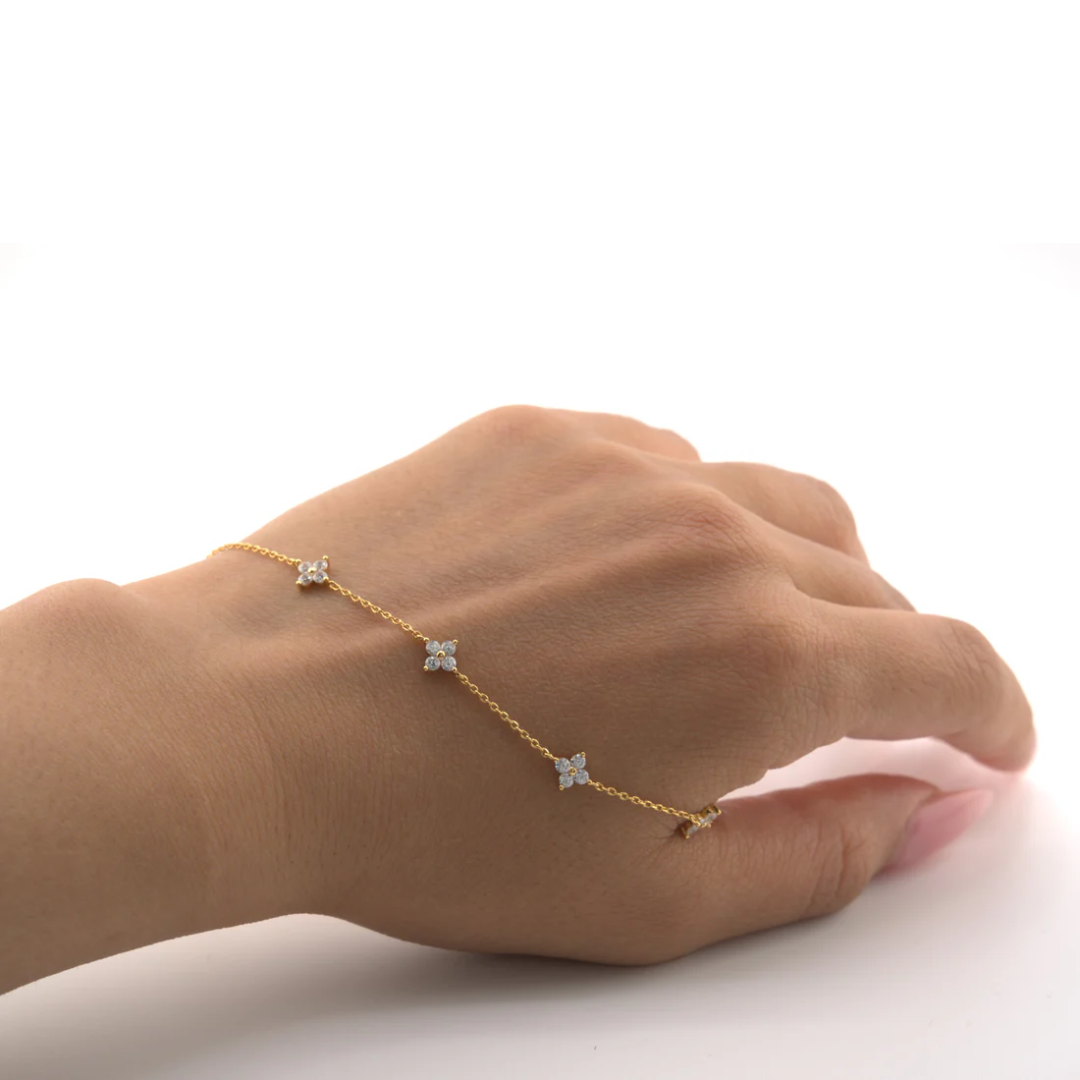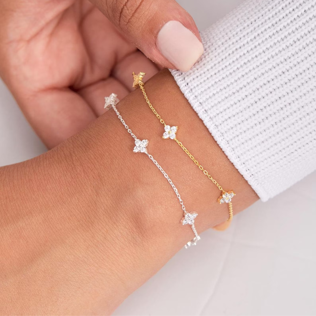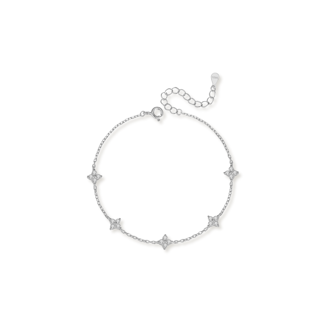 Add a touch of everyday magic to your jewelry collection with our Four-Leaf Flower Bracelet. This delicate, dainty piece features sparkling cubic zirconia blooms set in 925 silver plating for a look that feels both fresh and timeless. Whether you wear it solo for a hint of sparkle or stack it with your favorite bracelets for a curated, on-trend vibe, this adjustable chain fits effortlessly into your daily routine.